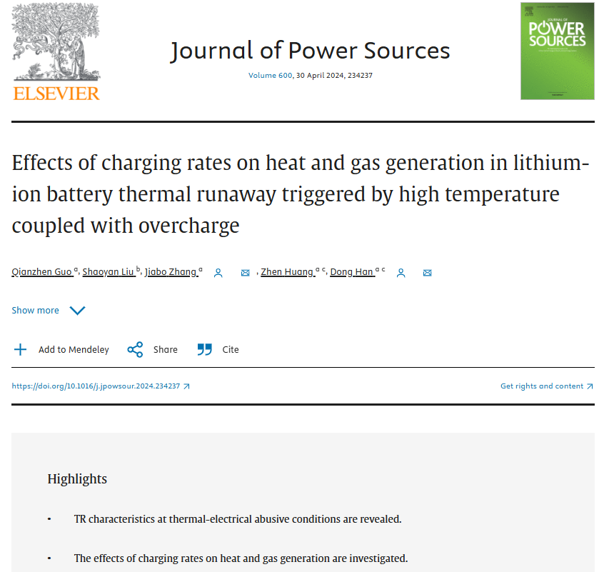 上海交通大學(xué)韓東教授課題組郭岍楨博士等在期刊 Journal of Power Sources 上發(fā)表論文 Effects of charging rates on heat and gas generation in lithium-ion battery thermal runaway triggered by high temperature coupled with overcharge。