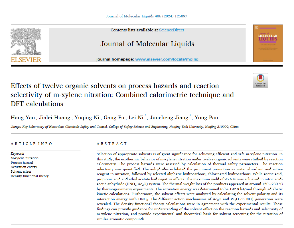 南京工業(yè)大學(xué)倪磊教授團(tuán)隊(duì)在Journal of Molecular Liquids期刊發(fā)表論文《Effects of twelve organic solvents on process hazards and reaction selectivity of m-xylene nitration: Combined calorimetric technique and DFT calculations》,該成果由國(guó)家自然科學(xué)基金項(xiàng)目(No. 21927815, 52334006, 52274209)等支持。