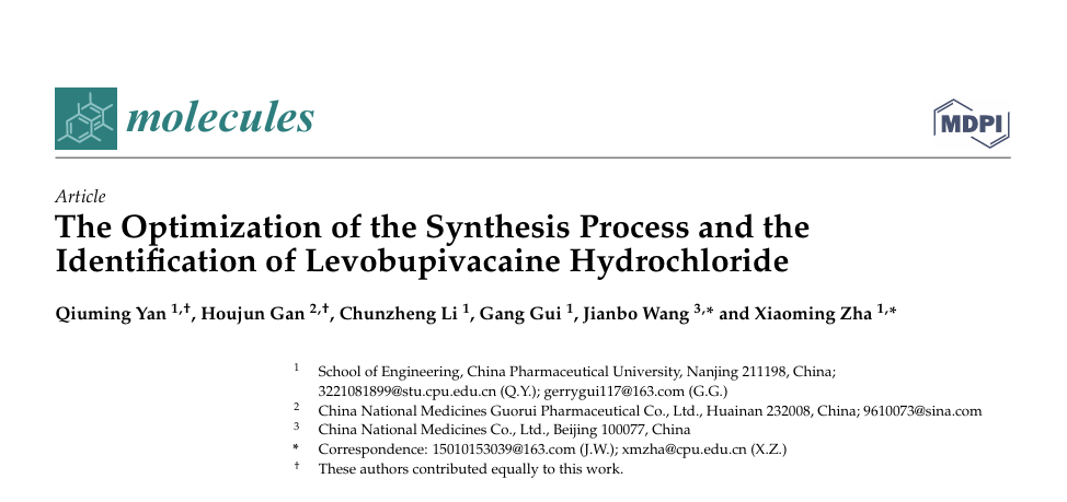 中國藥科大學工學院查曉明教授團隊在Journal | [J] Molecules(IF:4.2)發(fā)表題為The Optimization of the Synthesis Process and the Identification of Levobupivacaine Hydrochloride論文,該成果由中國藥科大學工學院、國藥集團國瑞藥業(yè)有限公司及中國民族醫(yī)藥股份有限公司等機構聯(lián)合支持。