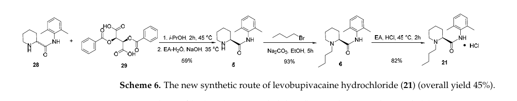 本研究從起始原料的可用性和成本效益、操作簡便性、綠色環(huán)保、設備可及性、工業(yè)化可行性、優(yōu)化的手性合成和安全性等維度考慮,優(yōu)化和改進了一種更可行的鹽酸左布比卡因(21)合成工藝(Scheme 6),這種新方法能克服現有方法的復雜性和高成本,有利于促進大規(guī)模工業(yè)化生產。